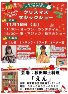 11月18日(土)綾瀬「えん」にて、どこよりも早いクリスマスマジックショー開催決定!